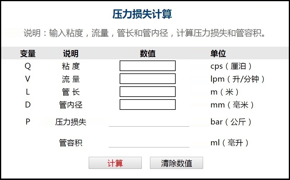 摘要:输入粘度,流量,管长和管内径,计算压力损失和管容积。